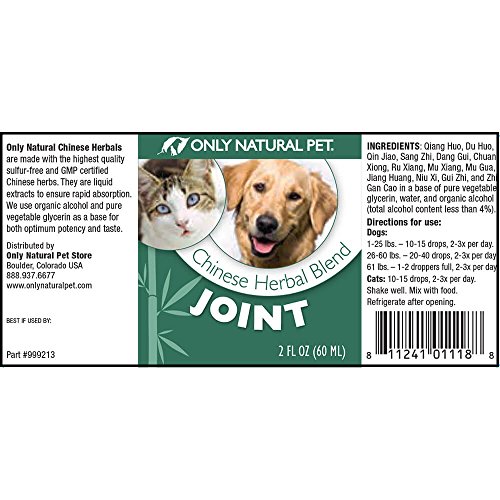 -. Binding : Misc. -. Brand : Only Natural Pet -. EAN : 0811241011188 -. Feature : For Pet Type(s): Dogs & Cats / Completely Natural / ApproP.R.Iate for all ages and breeds -. Label : Only Natural Pet -. Manufacturer : Only Natural Pet -. Model : mp-999213 -. MPN : mp-999213 -. NumberOfItems : 1 -. PackageQuantity : 1 -. PartNumber : mp-999213 -. ProductGroup : Pet Products -. ProductTypeName : PET_SUPPLIES -. Publisher : Only Natural Pet -. Size : 2-oz Bottle -. Studio : Only Natural Pet -. Title : Only Natural Pet Chinese Herbal Blends Joint -. UPC : 811241011188