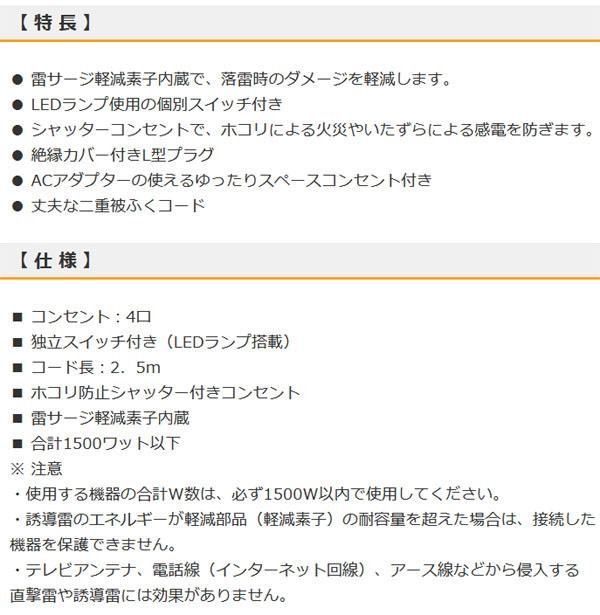 LEDランプ使用の個別スイッチ付き。シャッターコンセントで、ホコリによる火災やいたずらによる感電を防ぎます。 生産国:中国 ※サプライヤー直送品 ご注文後3~4営業日後の出荷となります【商品名】OHM 雷ガード&LED個別スイッチ付き 節電タップ 4個口 2.5m HS-T1950W