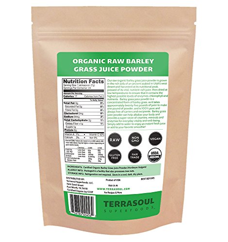 Our raw organic Barley Grass Juice Powder is grown in the rich soils of an ancient seabed in Utah's west desert and harvested at its nutritional peak, pressed of its vital, nutrient-rich juice, then dried at low temperatures to ensure that it contains the highest possible levels of enzymes, chlorophyll and nutrients. Barley Grass Juice Powder is a concentrated form of barley grass, as it takes approximately twenty five pounds of juice to make one pound of powder and is 100% pure and always free of carriers and excipients. Barley Grass Juice Powder can help alkalize your body and provides a super-store of vitamins, minerals and enzymes for everyday vitality and well-being. Simply add to water to enjoy an instant fresh juice or add to your favorite smoothie. Terrasoul Superfoods operates a state licensed, certified organic food processing facility and distributes the world's healthiest organic, nutrient-dense superfoods.Feature