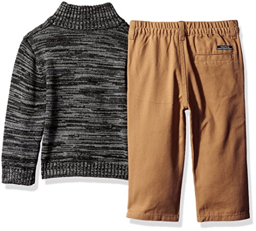 Nautica three piece set which includes a woven button down shirt, a quarter zip sweater and flat front twill pants.