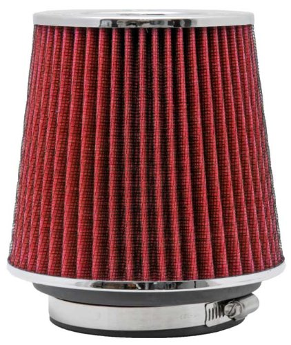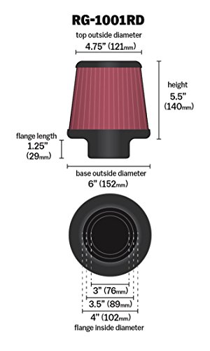K&N RG-1001RD Universal Clamp-On Air Filter: Round Tapered; 3 in/3.5 in/4 in (102 mm/89 mm/76 mm) Flange ID; 5.5 in (140 mm) Height; 6 in (152 mm) Base; 4.75 in (121 mm) Top