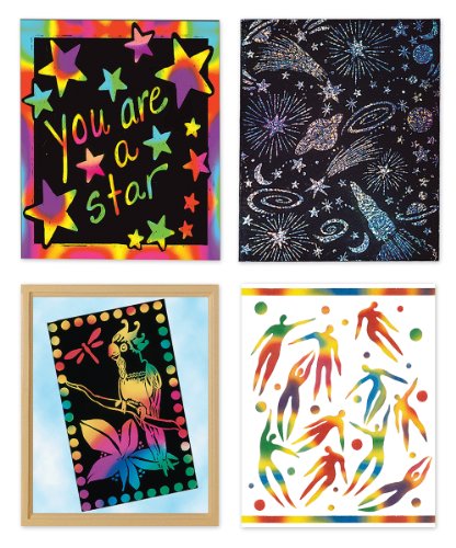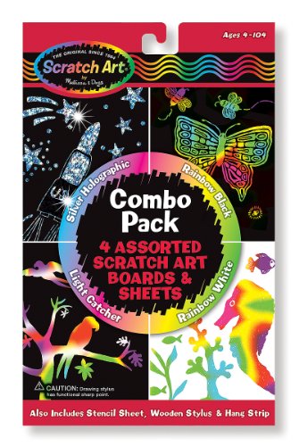 With a Scratch Art Draw Learn Boards, your little loved on will delight in creating their own dazzling pictures by simply scratching with the enclosed wood drawing stylus to create amazing pictures and learn lots of incredible stuff too. Encourage designing one's own masterpiece, this art craft kit from Melissa Doug is ideal for all ages, abilities and artistic styles. This pack includes: 1 stencil sheet, 1 wooden stylus, and 1 hang strip, 4 Scratch Art Sheets (1 Silver Holographic, 1 Rainbow Black, 1 Rainbow White, and 1 Light Catcher.) This series is made up of the items below (EACH SOLD SEPARATELY): ? BCC955E51-00007720O145 (Crown) ? BCC955E44-00007720O2Y (Key Chains) ? BCC955E37-00007720OZ9 (Safari Animals) ? BCC955E20-00007720O1D (Sea Life) ? BCC955EY-0000772058001 (Light Catcher) ? BCC955E06-0000772058025 (Rainbow (White Surface)) ? BCC9558O0-00007720580R (Combo Pack) ? BCC95585D-00007720580J (Holographic Combo Pack) ? BCC95585H-0000772058087 (Photo Frames)