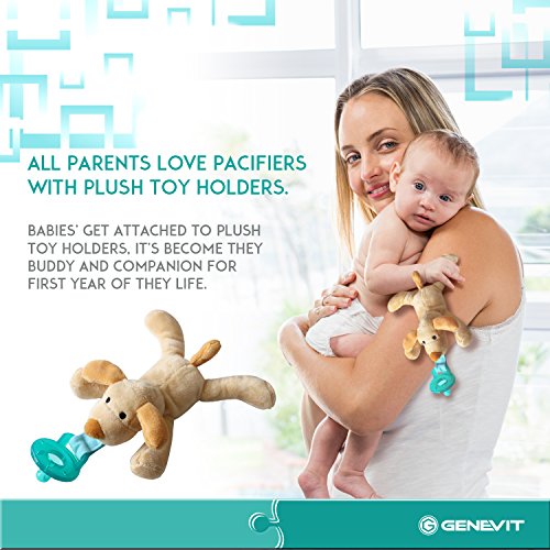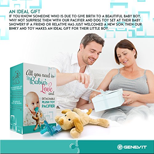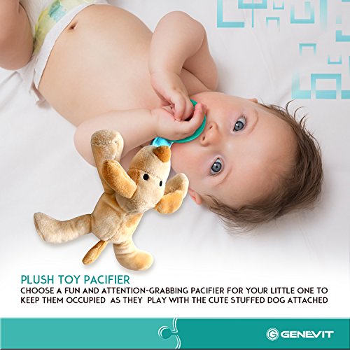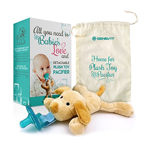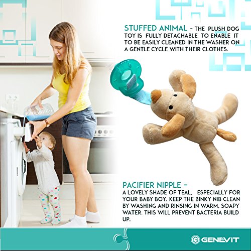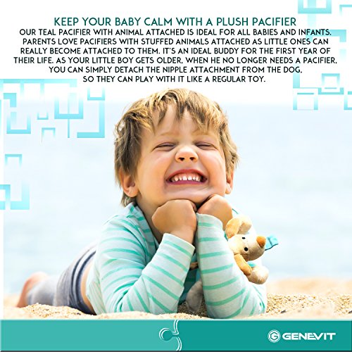 -. Binding : Baby Product -. Brand : Genevit -. Color : Green -. EAN : 0860311001406 -. Feature : PLUSH TOY PACIFIER - choose a fun and attention-grabbing pacifier for your little one to keep them occupied as they play with the cute stuffed dog attached / HYGIENIC - a baby binky is far safer option for your little one to suck on instead of a finger which can breed bacteria and affect the directional growth of her teeth / BENEFITS - baby pacifiers give your child a sense of security and are known to ease their mood as well as exercise baby mouth, teeth and tongue development / STUFFED ANIMAL - the plush dog toy is fully detachable to enable it to be easily cleaned in the washer on a gentle cycle with their clothes / PACIFIER NIPPLE - a lovely shade of pink, especially for your baby girl. Keep the binky nib clean by washing and rinsing in warm, soapy water. This will prevent bacteria build up -. Label : Genevit -. Manufacturer : Genevit -. MPN : DPTP1 -. PartNumber : DPTP1 -. ProductGroup : Baby Product -. ProductTypeName : BABY_PRODUCT -. Publisher : Genevit -. Studio : Genevit -. Title : Baby Pacifier with Stuffed Animal Dog Toy Attached – Detachable – for Babies and Toddlers with Drawstring Fabric Bag – Teal - by Genevit -. UPC : 860311001406