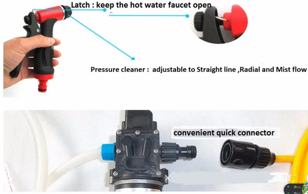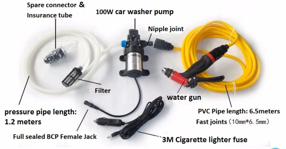 This is a great car washer set. Packaged with car washing pump and water gun high pressure pipe. Voltage: DC 12V; Power: 100W; Flow: 8L/min. Ideal for car use, car cigarette charger with over-current protection function. High pressure enable you to wash your car cleanly, water saving. Ideal for Washing Car, Window, Moto, Pet or Watering.