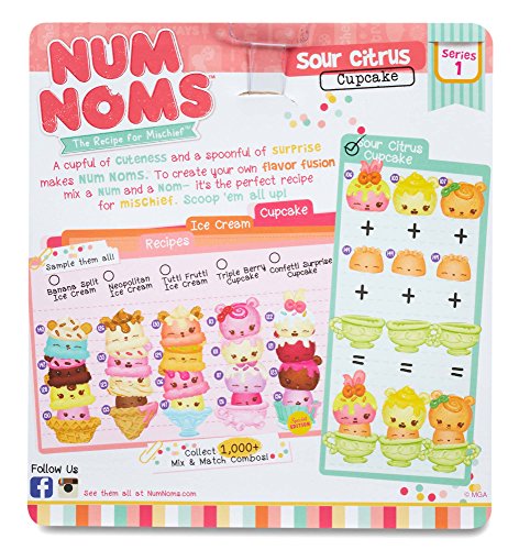 Series 1: Ice Cream and Cupcake 3 scented Nums in a variety of flavors - lemon, strawberry and orange 1 mango scented motorized Nom Includes all the Num Noms needed to create the Sour Citrus Cupcake recipe Includes collector's menu, cupcake cup, and spoon to scoop ‘em up 1,000+ mix & match combos! Sample them all! Ages: 3+ yearsFeature