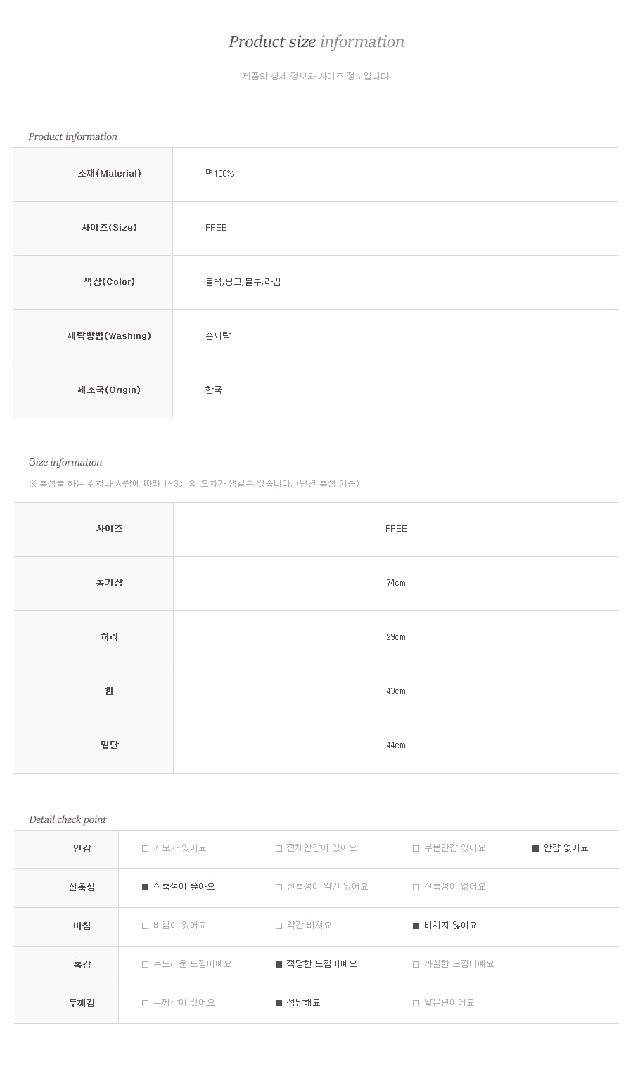 개인의 체형에 따라 핏이나 기장이 달라질 수 있으니 사이즈표를 참고 해주세요