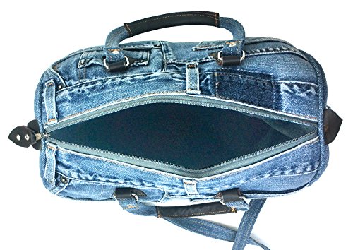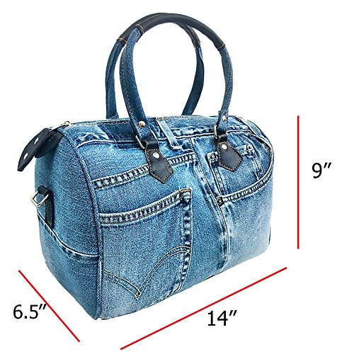 -. Feature : Material : recycle soft denim decorated with brown leather. *Please allow a little color different due to many monitors or devices.* / Barrel style in original denim jean pants. Our designer designed the work pieces as by the original denim pant. Hence each pieces of product may vary. The buyer may get handbag in dark shade or light shade. (Random) / Approx. measurement : H x L x W : 9 x 14 x 8 inches, handles drop 7 inches and removable shoulder strap adjust drop 28-54 inches. Weight 1.5 lb. / Zipper top closure, polyester lining, outside pocket as jean pant. / This big everyday purse has roomy enough for Ipad, mobile, wallet and more your belonging.