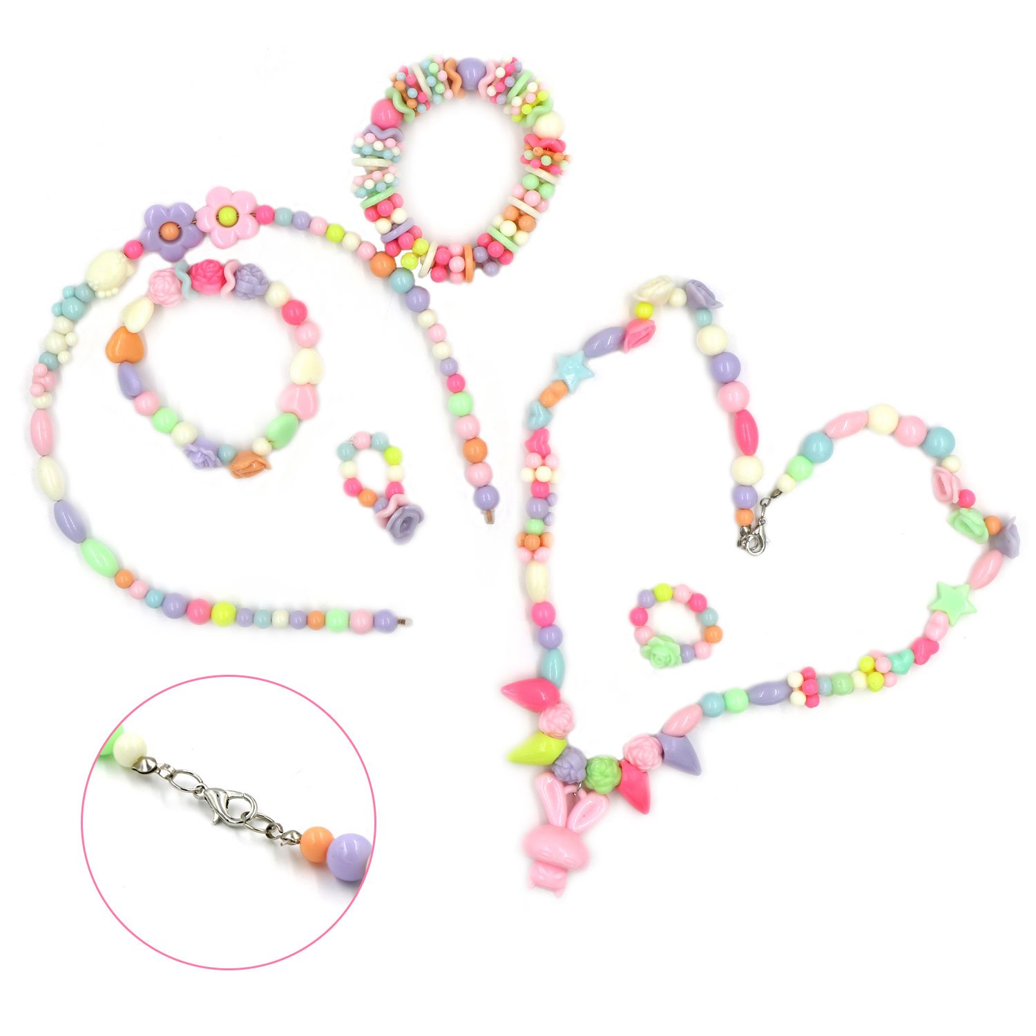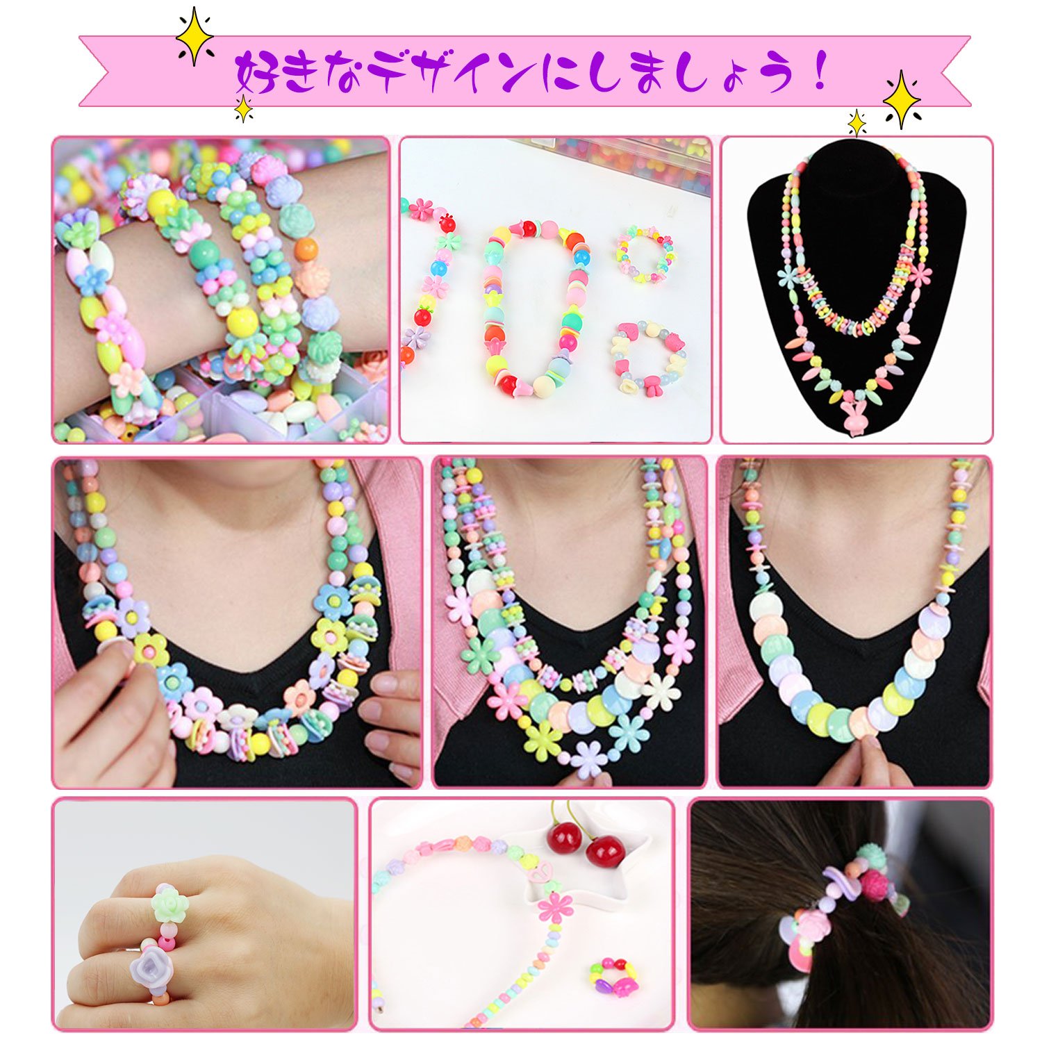 Various kinds such as bead parts your child likes, round shaped, heart shaped, flower shaped, rectangular, etc. are packed, coloring is also beautiful.