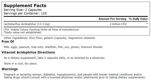-. Feature : What is Vitacost Acidophilus?Vitacost Acidophilus is a probiotic supplement providing 2 billion colony forming units (CFUs) of Lactobacillus acidophilus per two-capsule serving / Vitacost Brand