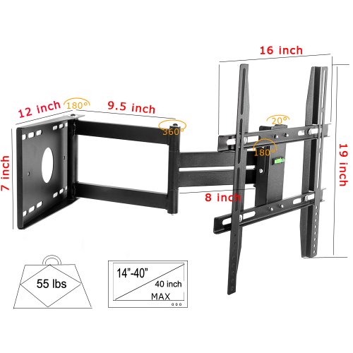 - Title : Lumsing Universal Corner TV Wall Mount Bracket with Full Motion Swing Out/Extendable & Tilting & Swivel Articulating Arm for 14"-40" LED, LCD, Plasma TVs and flat panel displays such as Dynex, Dell, Olevia syntax, polaroid, Sony, Samsung, LG, Haier, Panasonic, Vizio, Sharp AQUOS, Insignia, Westinghouse, Pioneer, ProScan, RCA, Toshiba, Magnavox, Sanyo, Philips, Emerson, Coby, JVC, AOC---Slim Profile Long arm Articulating TV Mount with 6 Feet HDMI and Magnetic Bubble Level!!!((Heavy-duty Solid Steel Construction! Hold Up to 55 lbs! 20 Degree forward/downward Tilt! 180 degrees Right / Left Rotation!Slim 3.25" profile when folded! Extends up to 19"! VESA standard 75/100/200/400)