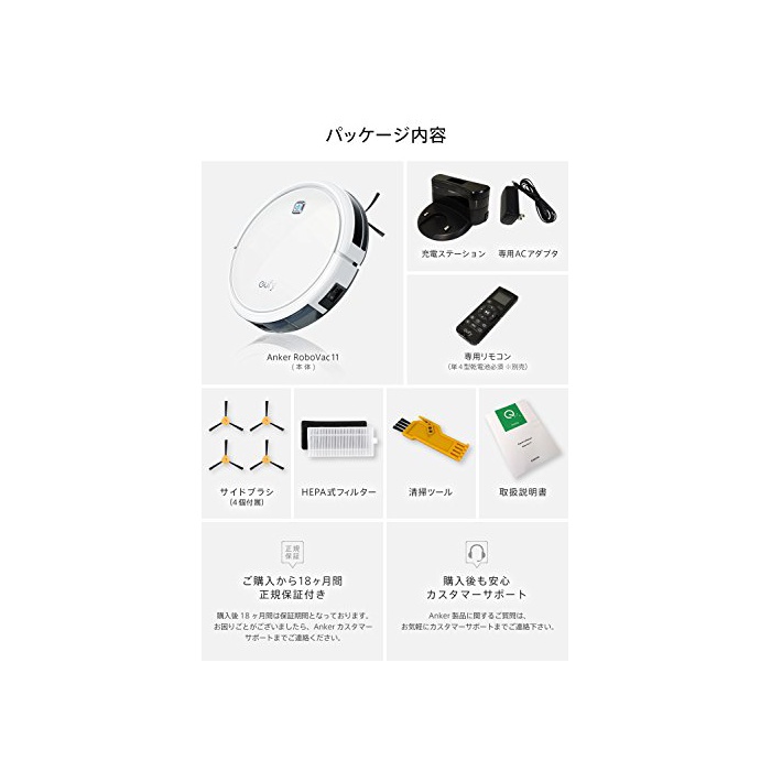 팩키지 내용:Anker RoboVac 11,전용 리모콘(단4 형건전지 필수 ※별매)고, 충전 스테이션,AC어댑터,청소 툴,HEPA식 필터,싸이드 브러시(x 4)고, 취급 설명서,18개월 보증,고객 서포트