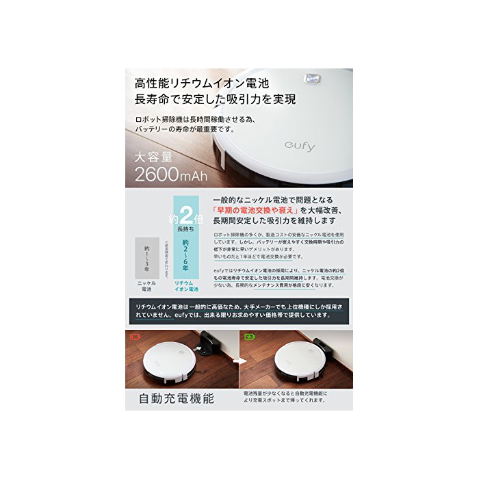 장시간 가동:전모델RoboVac 10보다(부터) 약30%커진 더스트 용기와 2600mAh의 대용량 리튬 이온 배터리에 의해약1.5시간의 연속 가동 시간을 실현.방 중의 쓰레기나 먼지를 흡인하는 것 를 할 수 있습니다.