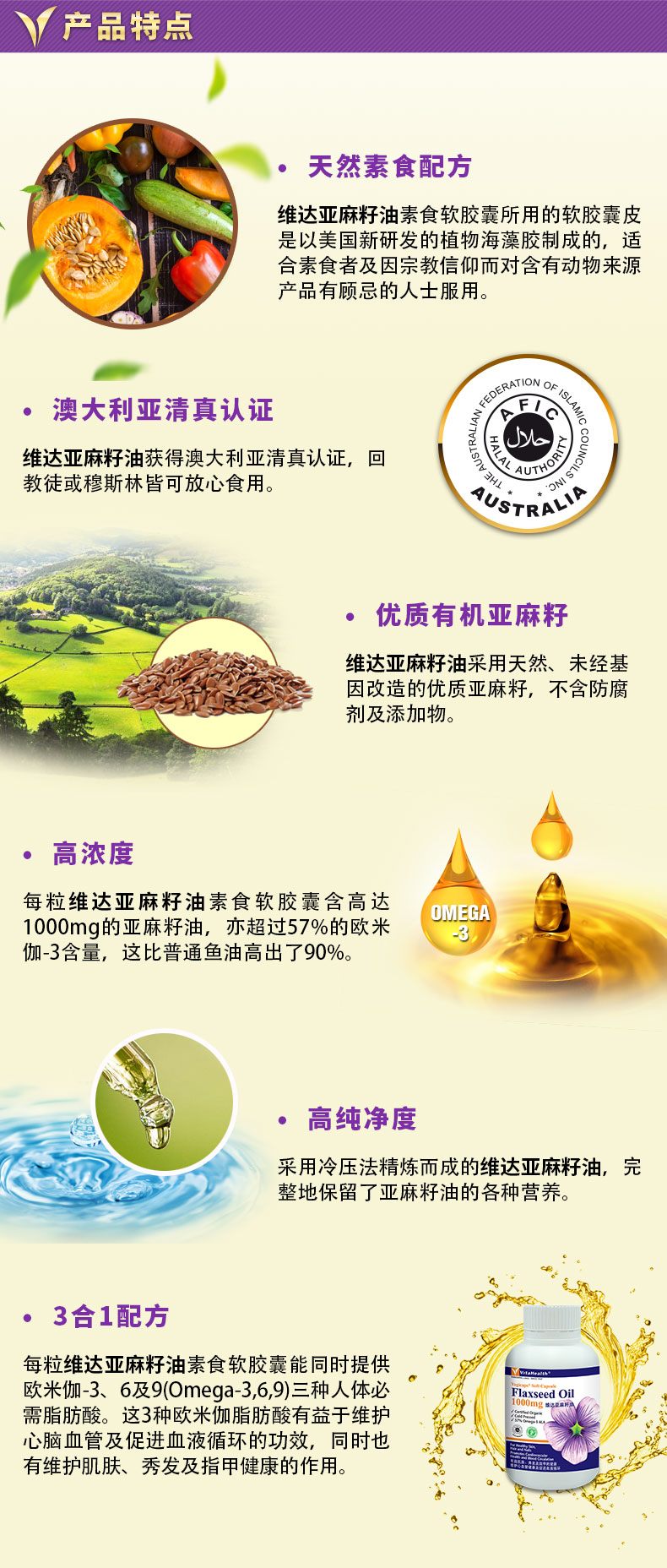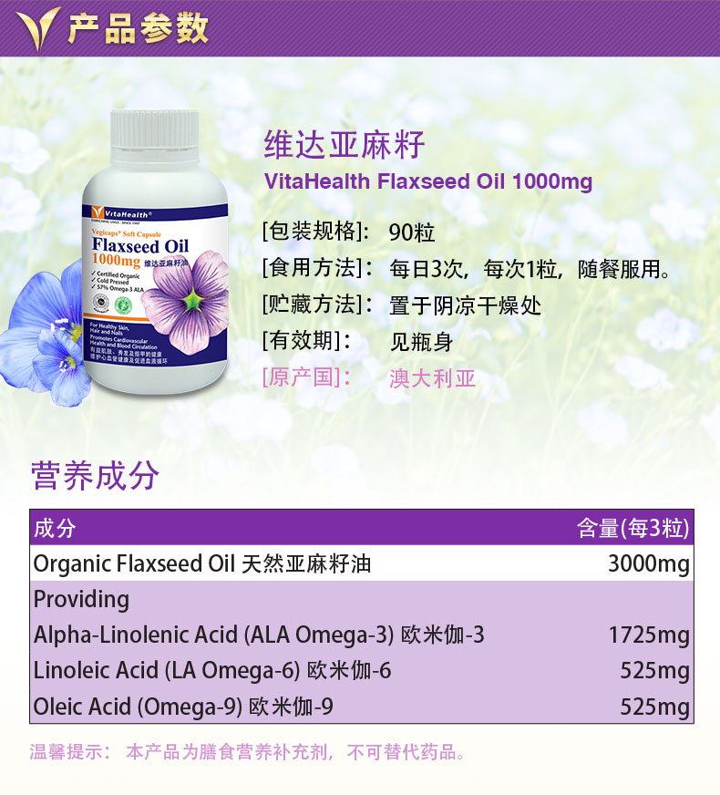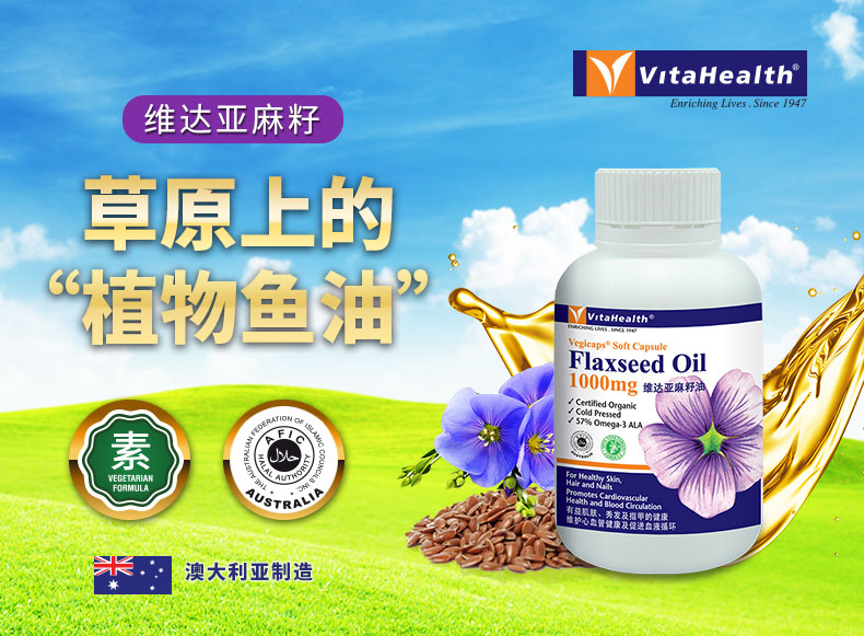 VitaHealth Flaxseed Oil 1000mg is the richest source of omega-3 fatty acid. It also contains healthy quantities of omega-6 and omega-9 fatty acids as well as lignans, an insoluble fiber that will be converted to anti-carcinogenic compounds in our body. It is ideal for vegetarians who want the benefits of omega-3 without taking fish oil. Not only it helps to support cardiovascular and joint health, it also promotes good digestive health.