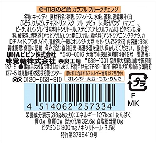 原材料:砂糖、ラフィノース、水飴、澱粉、濃縮果汁(白ぶどう、りんご)、デキストリン、スターフルーツピューレ、果汁パウダー(マンゴー、ピーチ、オレンジ)、甘味料(キシリトール、ステビア、アセスルファムK)、ビタミンC、香料、酸味料、増粘剤(アラビアガム)、ショ糖エステル、着色料(アントシアニン、クチナシ、カロチノイド、フラボノイド)、乳化剤、(原材料の一部に大豆を含む)