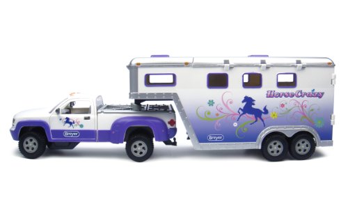 -. Feature : 3 horses can ride in the gooseneck trailer, with plenty of room for their food and gear! / Hinged roof panel allows easy access to the inside. / Matching pickup truck features duos that open and close, a drop-down tailgate, and rolling wheels. / Stablemates are 1:32 scale. / The quality and attention to detail you expect from Breyer, in a smaller size ideal for the young horse lover. / Includes truck and Gooseneck trailer / Horses sold separately / Features doors that open and close; a drop-down tailgate and rolling wheels