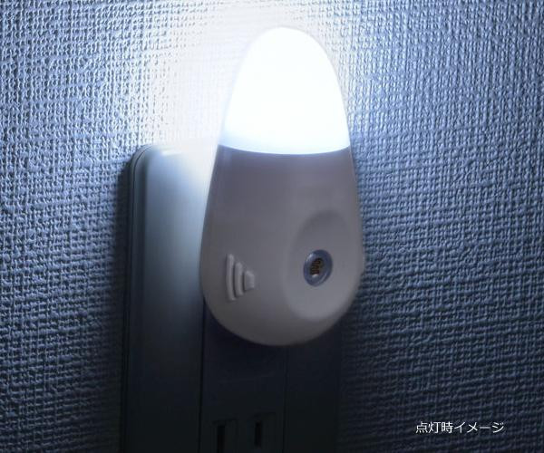 コンセントに差し込むだけで充電し、停電時に点灯する充電式ナイトライトです。明暗センサー付きで、周囲が暗くなると自動点灯、明るくなると自動消灯します。