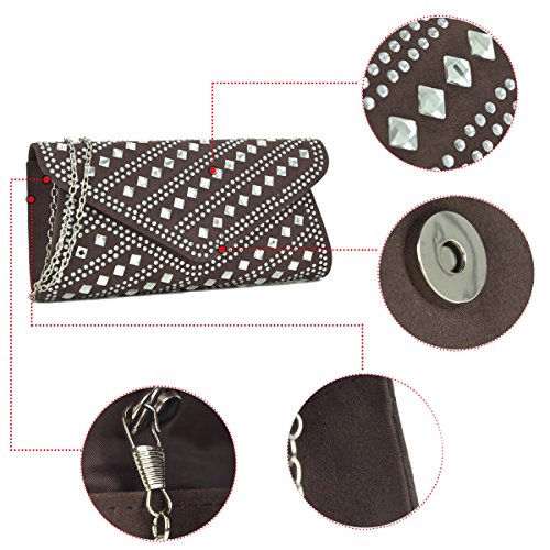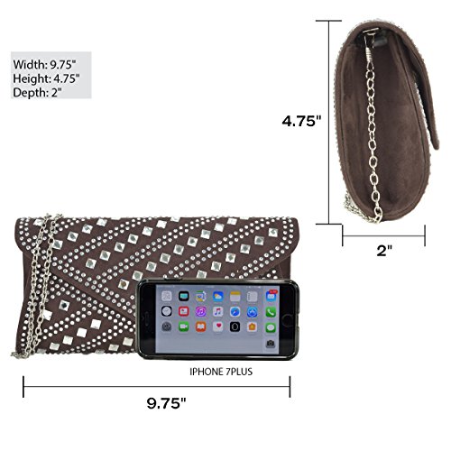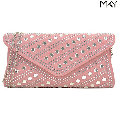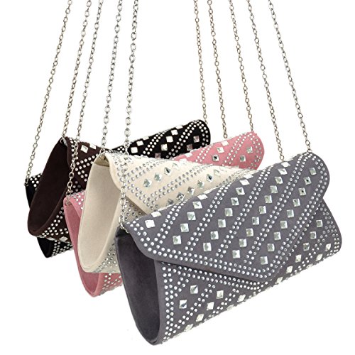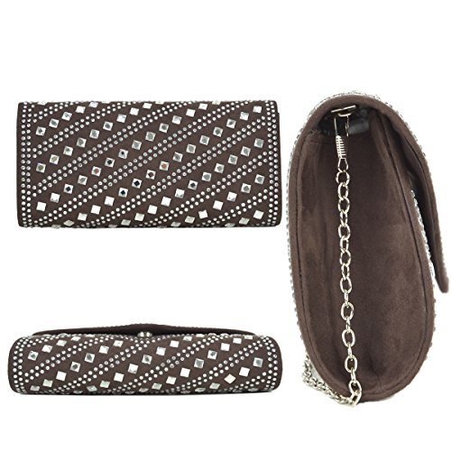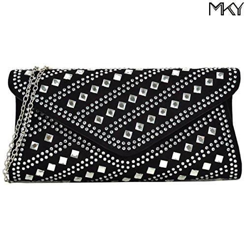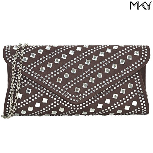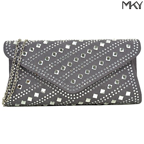 A smooth velvety clutch decorated with rhinestones and studs, flap top magnetic closure,