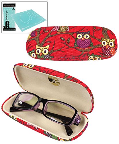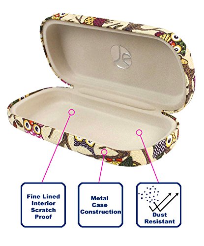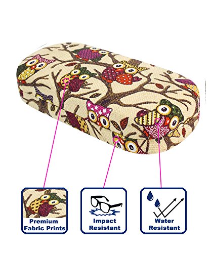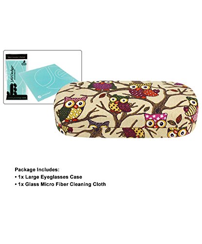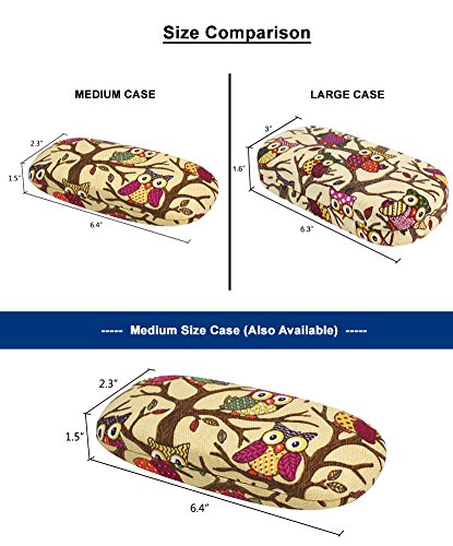 Give a hoot about your eyeglasses and protect them in this large owl eyeglass case! This hard-shell, structured eyeglass case is lined with fabric on the exterior and features an owl print. The interior is lined and will not scratch up the lenses. The large sized case measures 6.43 by 1.6 by 3 inches, and can fit standard sized eyeglasses and smaller sunglasses. The eyeglass case does not take up much room in a purse, or when stored on a bathroom counter. Protect your eyeglasses and store them in this whimsical owl patterned eyeglass case.Feature