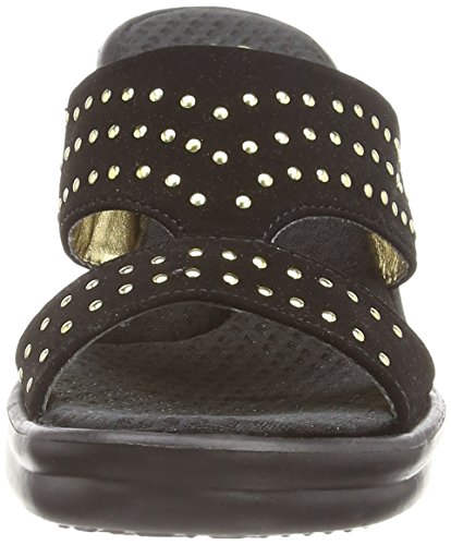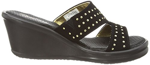 Wedge sandal featuring wide straps topped with decorative metallic studs