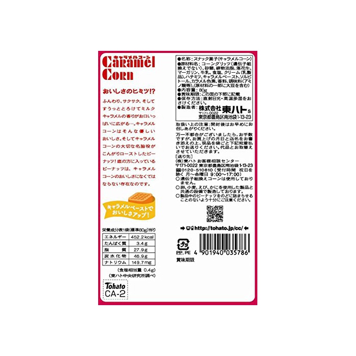원재료:콘《구릿츠》(유전자조 교환이 아니다)고, 설탕,식물성 기름지,땅콩,마가린,우유,식염,크림(유제품)고, 허니,카라멜 Paste,솔《비토루》,카라멜 색소,향료,조미료(아미노산등)고,(원재료의 일부에 대두를 포함한다)