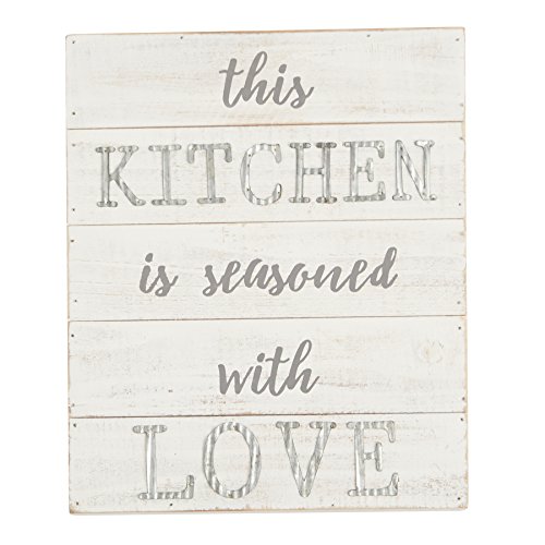 - Planked, painted wood plaque features this kitchen is seasoned with love sentiment with corrugate tin accents