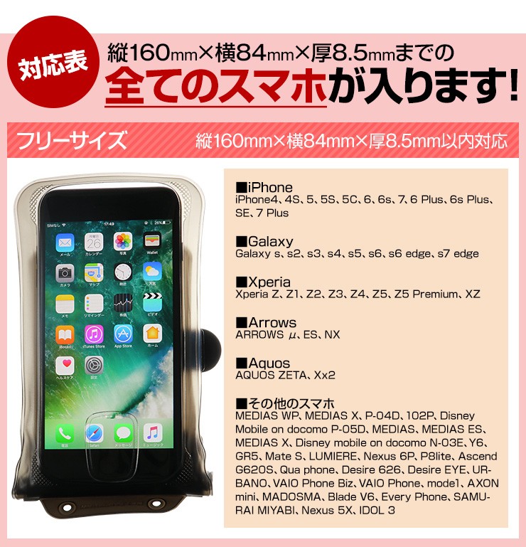 | 対応機種 | 5.7inch以下 縦160mm×横84mm×厚8.5mm以内のiPhone・スマホ |