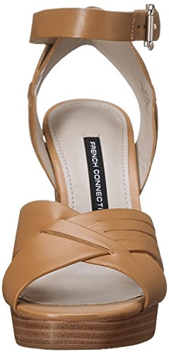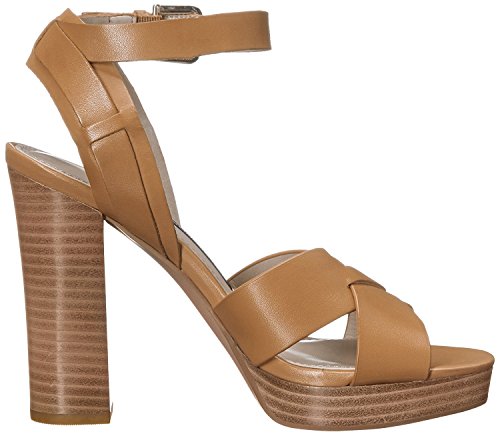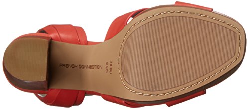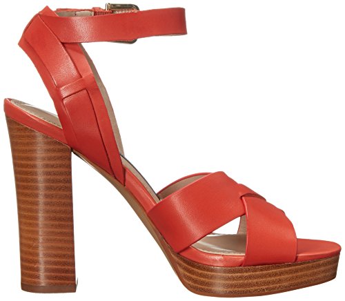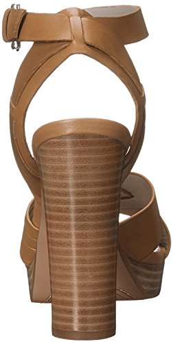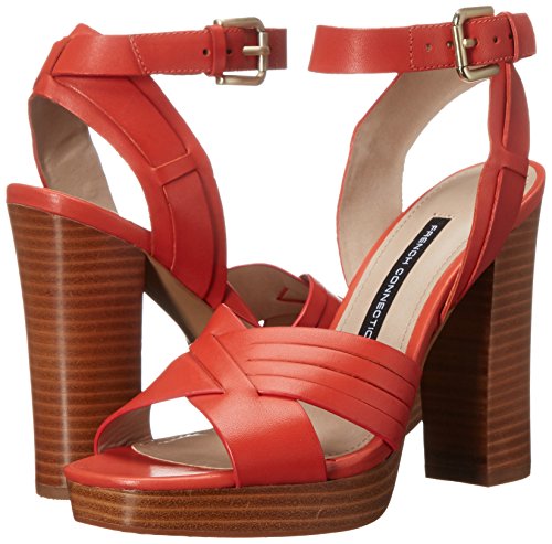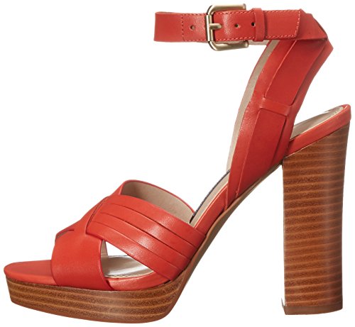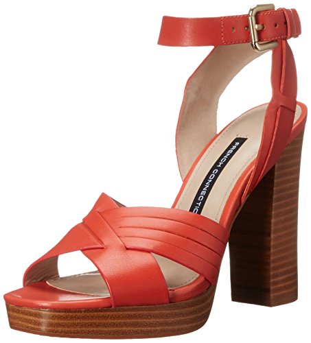Stacked-heel sandal featuring crisscross toe straps with woven detail
