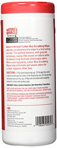Studio : Nature's Miracle Publisher : Nature's Miracle Binding : Misc. Product Description Nature’s Miracle® Litter Box Scrubbing Wipes adds the convenience of a wipe to a best selling formula. The quilted texture, with grip dot technology, easily lifts stuck-on debris while the deodorizing formula eliminates odors. When used regularly, Litter Box Scrubbing Wipes help eliminate pet waste odors for a clean, hygienic litter box. 0