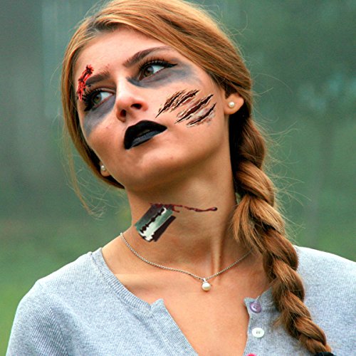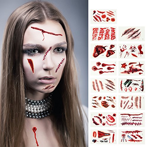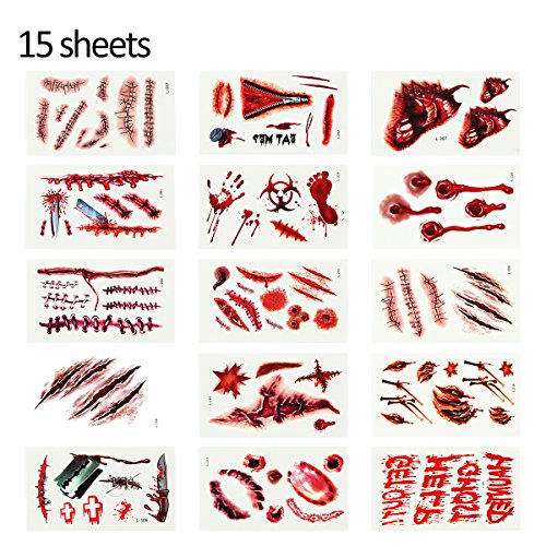 15 sheets different designs waterproof Halloween tattoo include bloody scars,Wound Stitch Scar,Scab,Realistic knife stab wound,etc