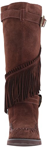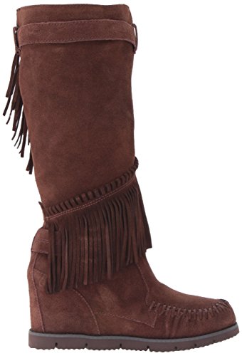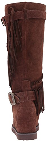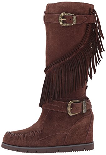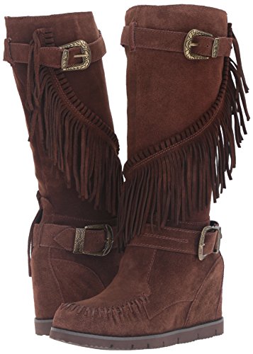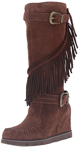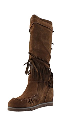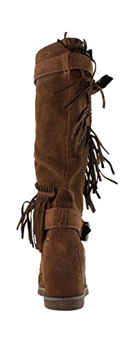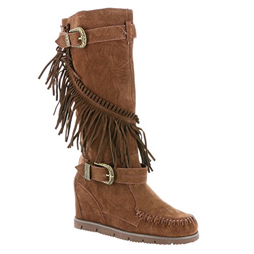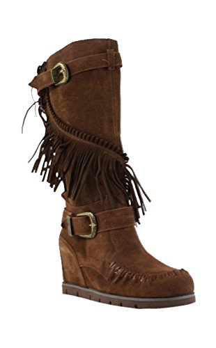 Product DescriptionMid shaft suede fringe wedge boot with buckle detail0