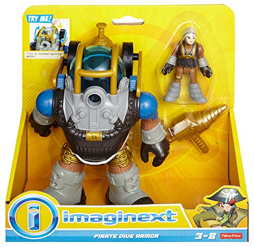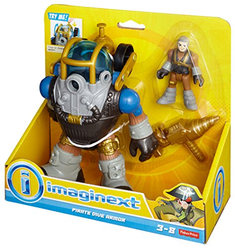 -. Binding : Toy -. Brand : Fisher-Price -. EAN : 0746775314026 -. Feature : Press the button on the rear tank to raise the left arm and activate the flywheel-spinning action! / Includes Dive Armor, pirate figure that fits inside, and drill that attaches to either Dive Armor arm / Look for other Imaginext Pirate figures and vehicles to add to the high-seas high jinks! (Sold separately and subject to availability) / Kids will have a blast creating adventures with these characters / Great addition to any Imaginext collection! -. Label : Fisher Price -. Manufacturer : Fisher Price -. Model : BFR99 -. MPN : BFR99 -. PackageQuantity : 1 -. PartNumber : BFR99 -. ProductGroup : Toy -. ProductTypeName : TOYS_AND_GAMES -. Publisher : Fisher Price -. Studio : Fisher Price -. Title : Fisher-Price Imaginext Pirate Dive Armor -. UPC : 746775314026 -. Warranty : No Warranty