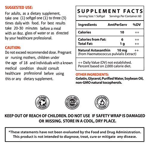 -. Feature : FEEL HEALTHIER, NATURALLY! Powerful antioxidants like Astaxanthin assist your body in getting rid of free radicals. This can prevent a lot of long term damage to your body and may protect your cells from premature aging and death. / LESS PAIN, MORE GAIN! Astaxanthin may lower inflammation in your body naturally, helping you feel better after exercise or any muscle and joint strain. May lessen soreness after exercise. / PROTECTS HEART, JOINTS AND EYES! This product has been shown to assist your body in keeping the cardiovascular system healthy, while also helping to protect eyes and joints from inflammation. / THE PERFECT QUALITY YOU DESERVE! All Vitanesis products are made in the US under strict GMP manufacturing laws. Only the highest grade ingredients are used to ensure maximum potency in every capsule. / BECOME HEALTHIER OR YOUR MONEY BACK! If for any reason you are not completely happy with our product we give you a full refund. This is a risk free purchase. Try it out now and thank us later!