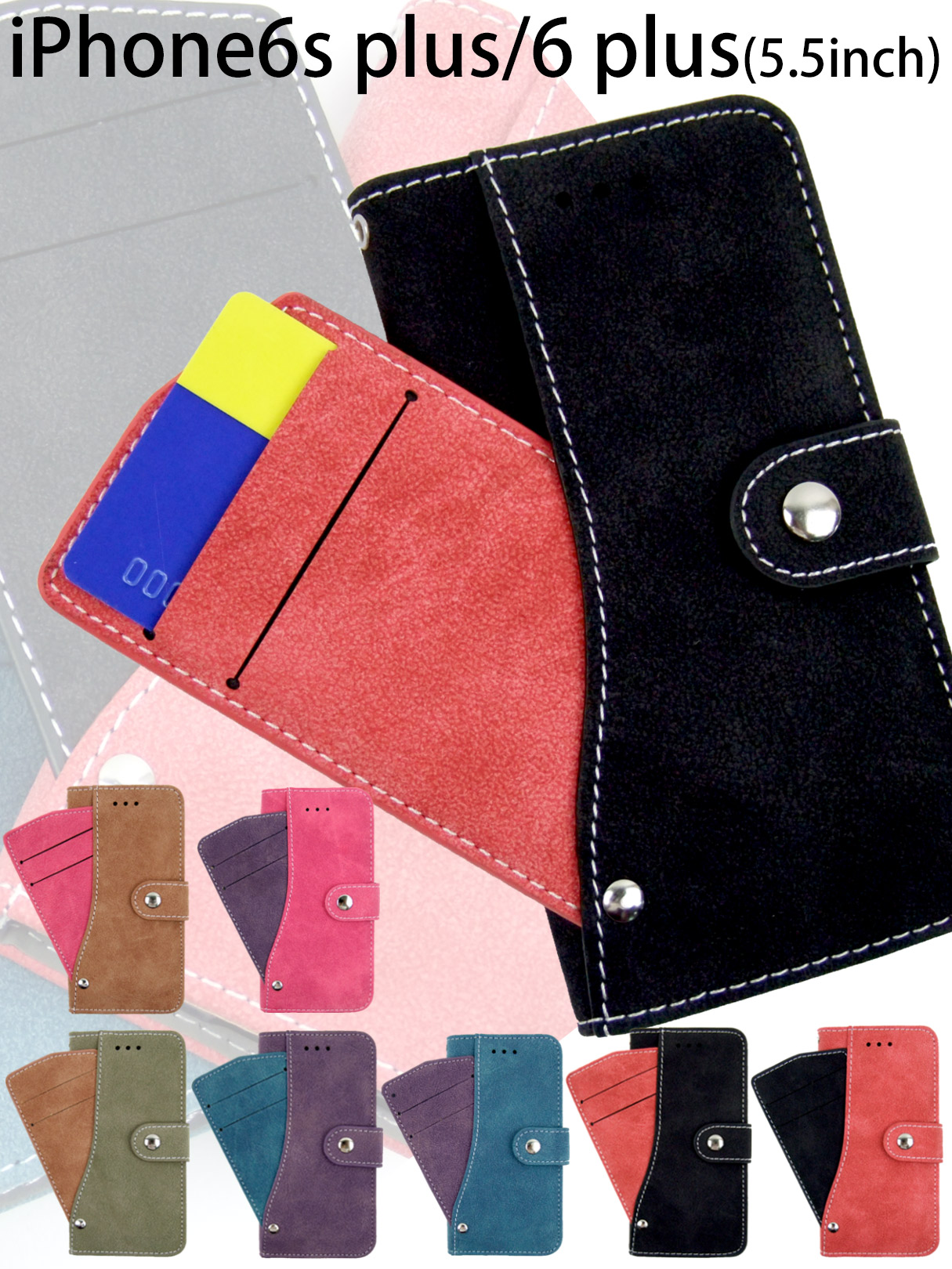◆手帳型iPhoneケース◆手触りのいいスウェード風素材の手帳型iPhoneケースです。前面に収納された回転式のカードケースにより、他の手帳型ケースよりも多めのカードを収納できます。コンビニやちょっとしたお出かけには便利。カードケースを振り出した状態ならicカードも安定して使用できそうです。ボディとカードケースがツートンカラーになっており、選べる7パターンラインナップ全7色PUレザーとは、「ポリウレタンレザー」の略称になります。素材としては、柔らかくしなやかで、肌の様な風合いがあり、より本革(天然皮革)に近い質感があります。疑似本革として、最高級にあたります。弾力性、柔軟性が高く、スマートフォンケースに適している素材です。通気性があり、撥水性も高いのでメンテナンスが非常に簡単です。お手入れについて(PUレザーは水分に弱いのでお手入れの基本は乾拭きでお願い致します。)※ご利用のモニター、ディスプレイにより若干色味に差がある場合がございます。ご了承ください。※商品の生産時における装飾等は海外にて手作業で行っており、多少の差異がある場合がございます。ご了承ください。