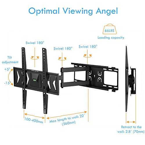 Specifications Size: Fit most 26"- 55" LED LCD OLED plasma TV Weight: Support TV weight up to 66Ibs (30kg) Fit VESA mounting hole patterns: 400X400mm/400X300mm/400X200mm/300X300mm/300X200mm/200X200mm/200X100mm/100X100mm Adjustable viewing angle: Able to swivel 90° left to right and tilt -5° to 15 for the perfect viewing angle Save space: Extend up to 18" and fold 2.8" to the wall to save space
