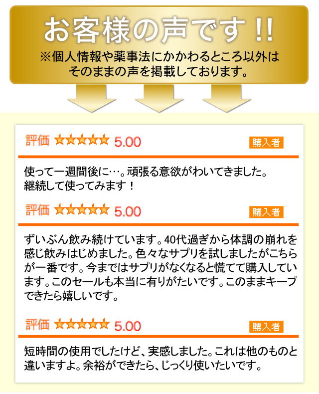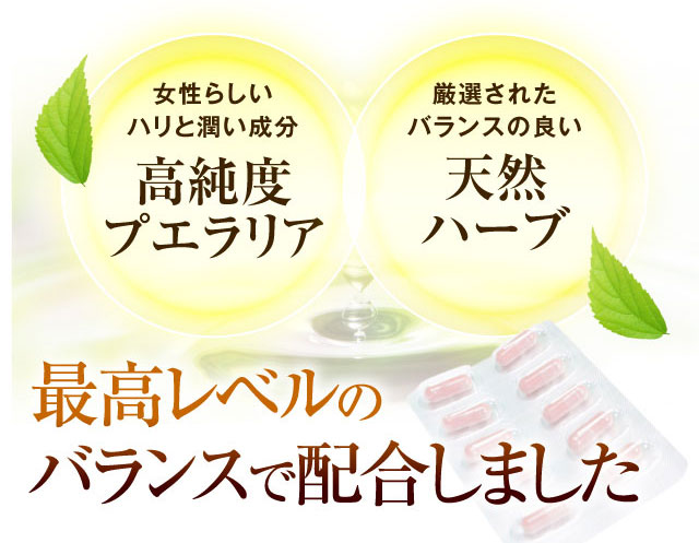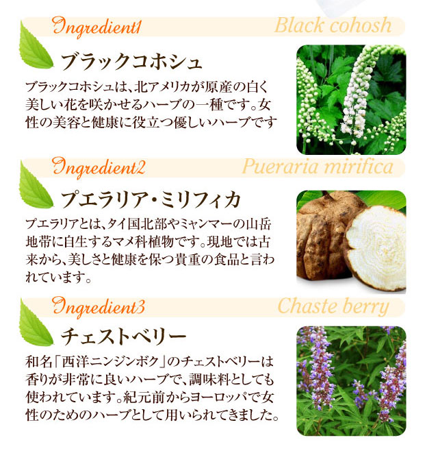 | 成分 | ブラックコホシュ、プエラリアミリフィカ、チェストベリー/結晶セルロース、ショ糖脂肪酸エステル、ステアリン酸カルシウム、クチナシ赤色素 |