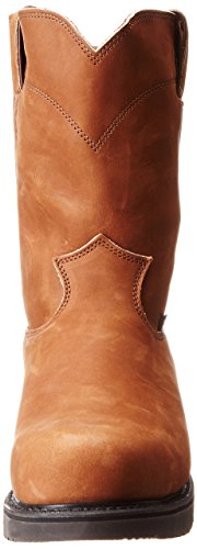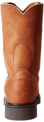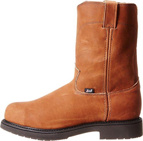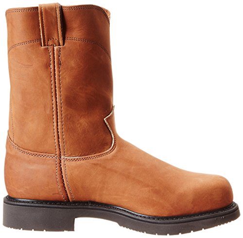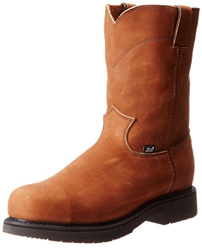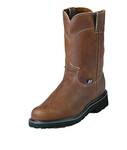 Studio : Justin Publisher : Justin Binding : Apparel Product Description Justin work boots that bring handcrafted quality of days gone by together with the comfort technology of the future This advanced work boot features a full grain aged bark leather foot under a mathing 10" pull-on leather shaft. Easy-on pull straps. Single stitched welt. Leather lined. Steel round toe. Imported. 0