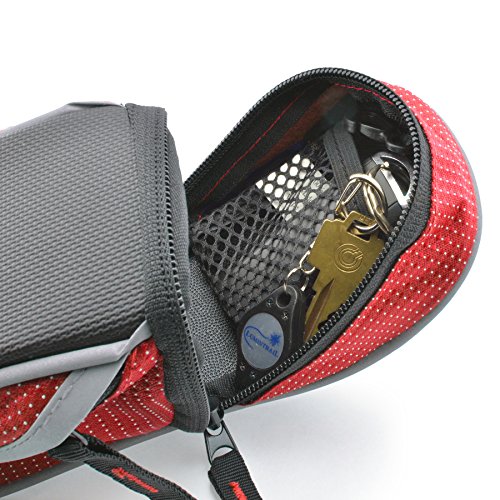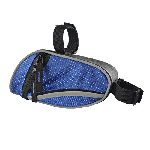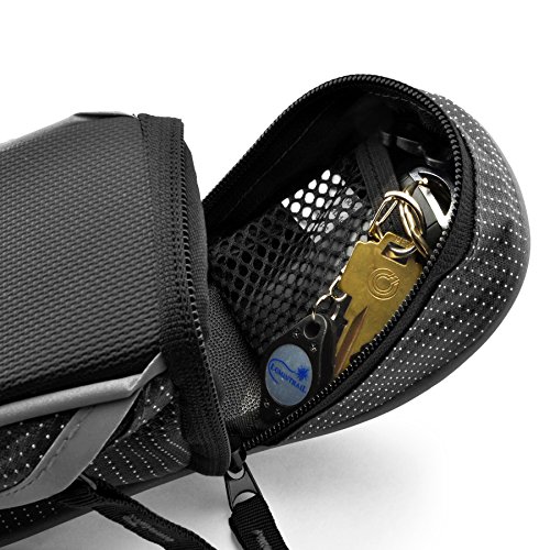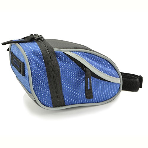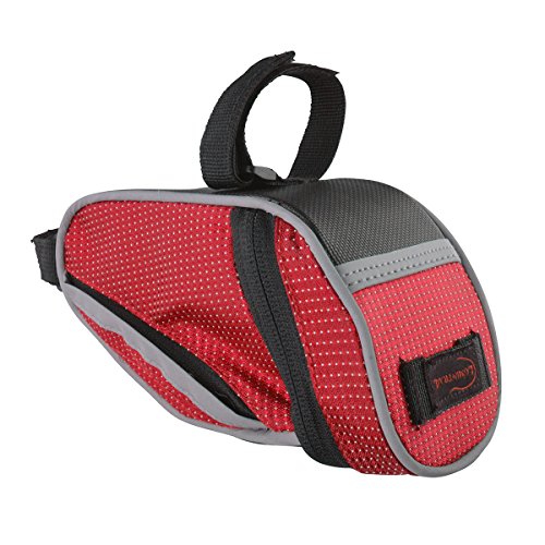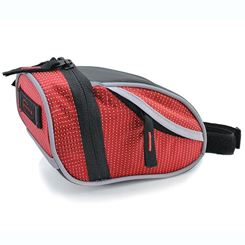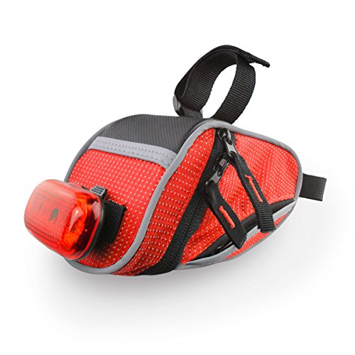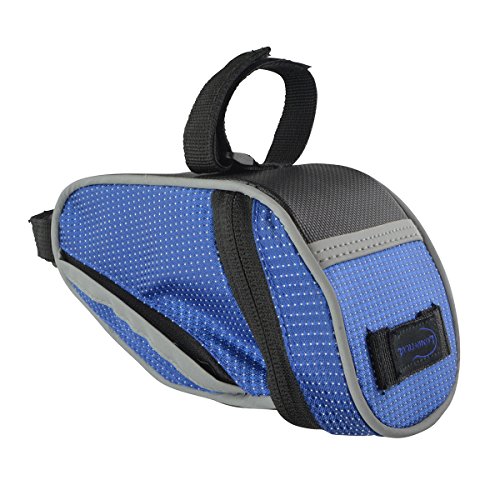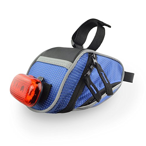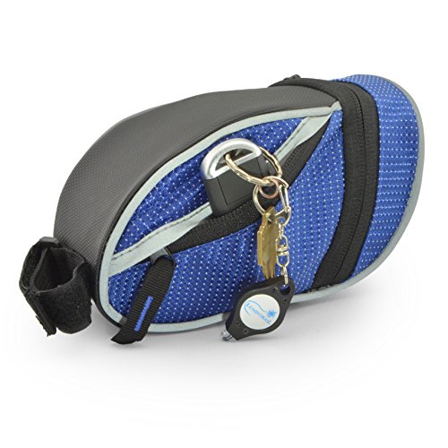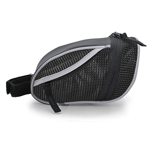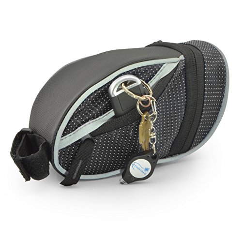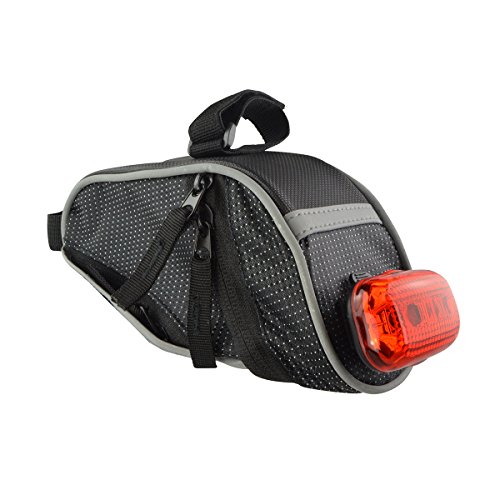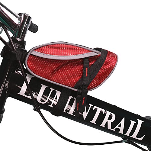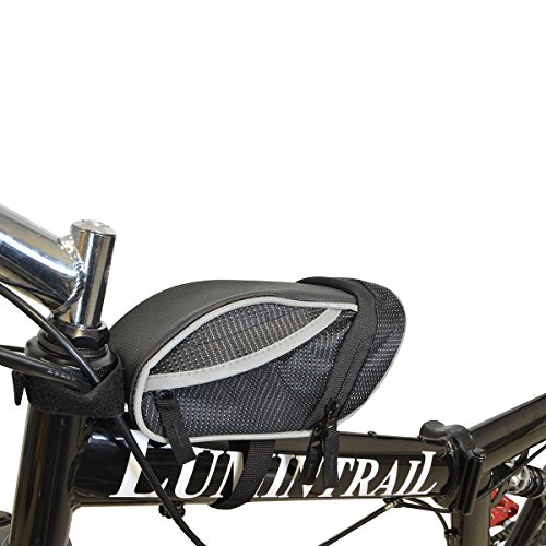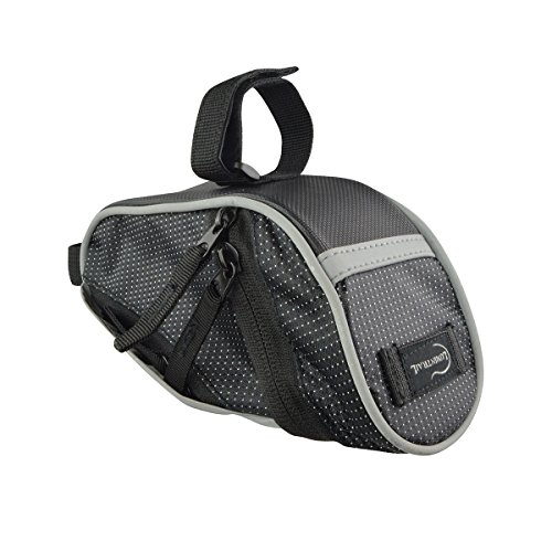 The Lumintrail bike bag holds your essentials out of the way while you ride. It's compact wedge design and snap-on adjustable hook and loop installation allows it to securely attach to your bike either on the front top tube for easy access or tucked away under the saddle. There is plenty of room to carry your essentials with one main compartment with key clip and mesh pocket and two smaller side compartments. Durable, weather resistant polyester construction ensure your items will be protected from the elements and reflective strips and tail light loop will help to increase visibility ensuring a safer ride. Features: - 2 Adjustable Velcro Straps for securing bag to bike