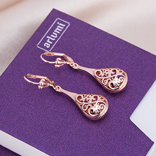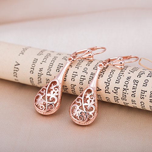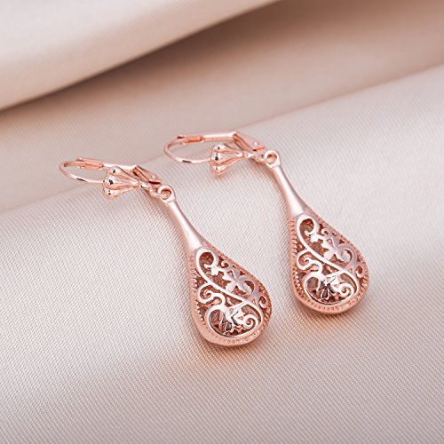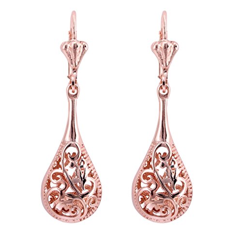 Description: Teardrop Dangle earring in Rose Gold plated featuring open center with Filigree allover cutouts, Lever back finding