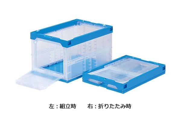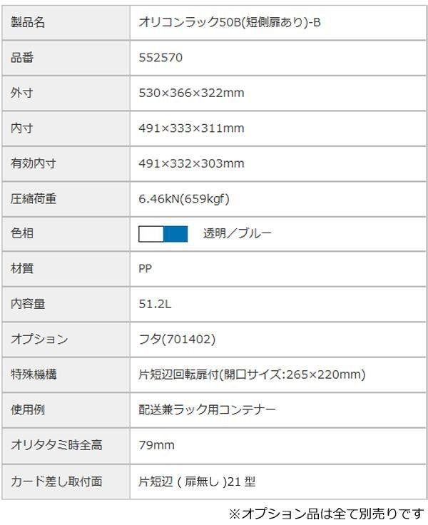 側面が透明で内容物の確認が一目でできる特長に加え、扉を付ける事により段積みした状態で内容物を取り出す事ができます。 製造国:日本 ※サプライヤー直送品 ご注文後2~3営業日後の出荷となります【商品名】三甲 サンコー オリコンラック(扉付オリコン) 50B-B(短側扉あり) 透明/ブルー 552570