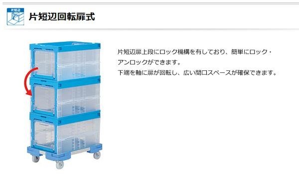 側面が透明で内容物の確認が一目でできる特長に加え、扉を付ける事により段積みした状態で内容物を取り出す事ができます。