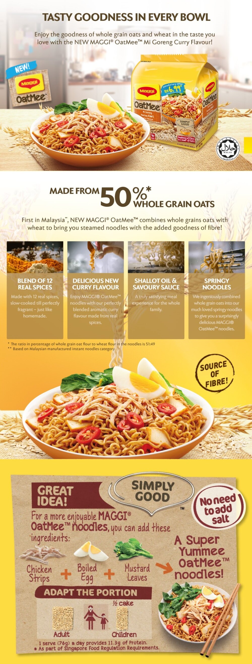 Now there’s a way to enjoy your favourite MAGGI noodles. First in Malaysia, MAGGI OatMee combines whole grain oats with real wheat to bring you steamed noodles with the added goodness of fibre. With its delicious new curry flavour that is made from a blend of 12 real spices, it will guarantee you a satisfying meal experience till the last bite!