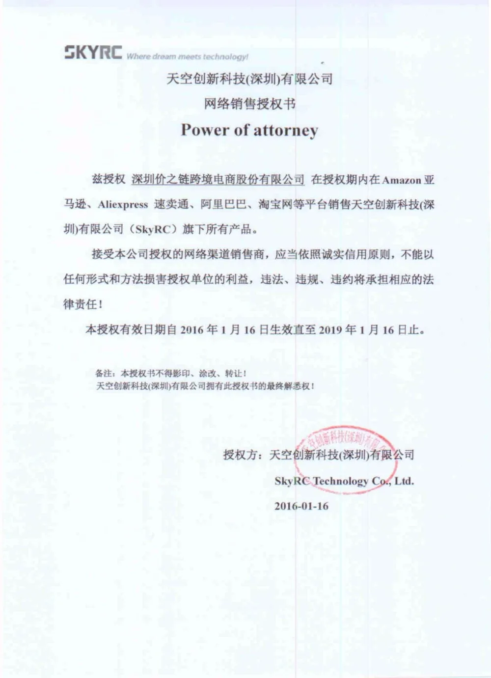 SKYRC Official authorized sales certificate: