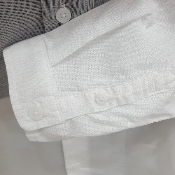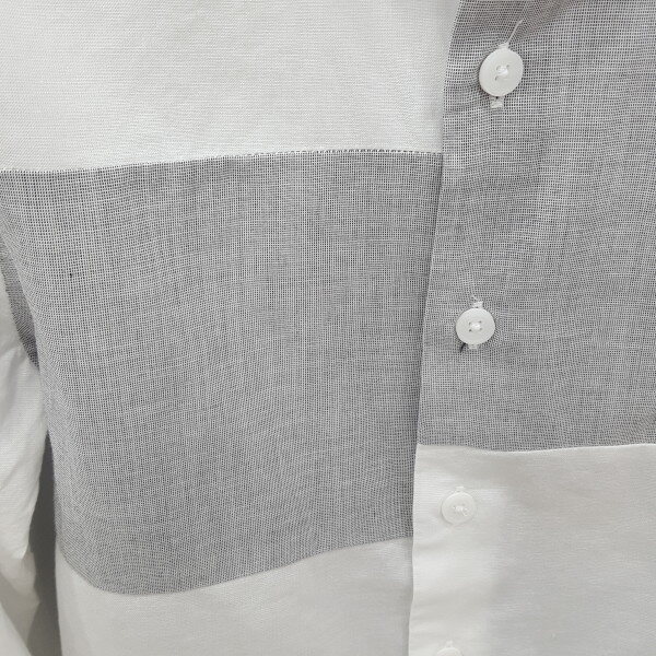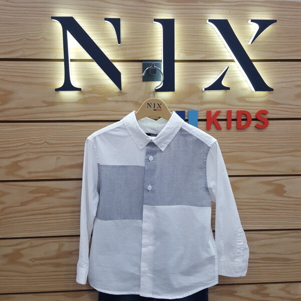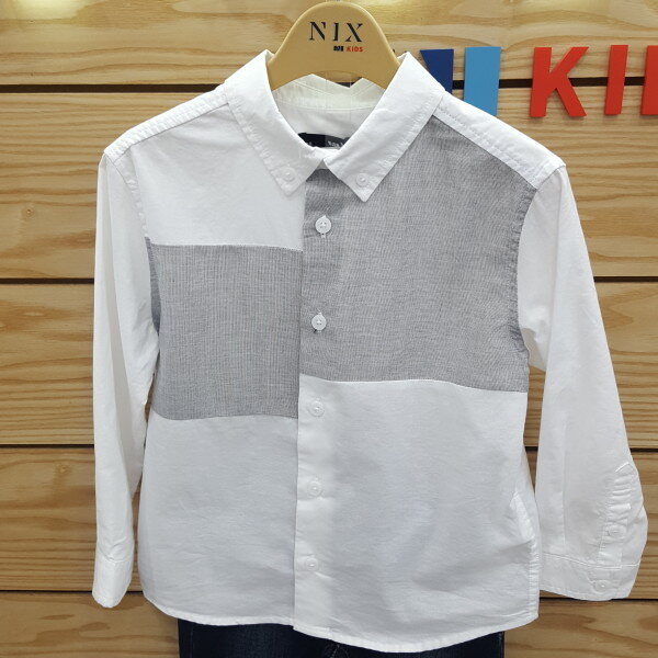 깨끗한 화이트몸판에 가슴에 절개배색이있는 남아버튼다운디테일의셔츠입니다.