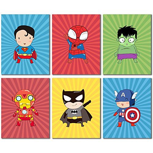 Adorable digitally produced watercolor poster prints of Superman, Spiderman, Batman, Ironman, Captain America and the Hulk!