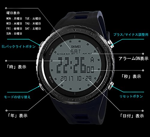 -. Feature : セット内容:デジタル腕時計+オリジナルボックス+日本語取扱説明書  ELライトの効果は画像のとおりでございます。ご確認の上お買い求めください。 / 仕様:ケース直径:約49mm ケース厚み:約14mm バンド長:約160-240mm調節可能 本体重さ:約57g ケース素材:高硬度PC素材採用、衝撃に優れています。バンド素材:柔らかいPU素材採用、非常にソフトで肌に優しいタイプです。 / 機能:①アラーム②ストップウォッチ③カウントダウン④ダブルタイム⑤50M防水⑥LED ライト⑦12/24 時間制⑧日付曜日表示 / シンプルなデザインで、屋内でもアウトドアでも使用できるスポーツデジタル腕時計です。かっこいいデザインで、ご家族やお友達などのクリスマスプレゼントにも! / *60日以内に返品・返金・交換サービスを提供致します。ご購入日から60日以内返品・返金・交換が可能です。是非お気軽に販売者までお問い合わせください。 *Miss Masaは「Timever」というブランドの独占販売権の所有者であります。ご注文になる際は、販売者名は「Miss Masa」であることをご確認ください。