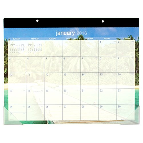 - Feature : Decorative desk pad gives you a serene tropical image every month ghosted behind a monthly calendar to escape to the beach every day / Covers 12 months January - December, allowing you to keep a full year's worth of plans in one beautiful place. Julian dates. / One month per page format is ideal for event planning. Each week starts on Sunday. Large, unruled daily blocks provide plenty of space for notes. Each block is 3 in. x 2 in. Past and future months displayed for quick and easy reference at a glance. / Blue top binding is punched with eyelets to allow use as a wall calendar. Durable backboard provides sturdy writing surface, whether on your desktop or on the wall, and two clear, poly corners ensures pages stay flat. / Page size: 22 in. x 17 in. Overall size: 22 in. 1 / 6 x 17.13 in. x .13 in. Contains 60% post-consumer material.