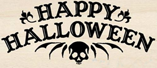 -. Title : {Single Count} Unique & Custom (3.55" x 1.75" Inches) "Festive Winged Skull Happy Halloween Text" Rectangle Shaped Genuine Wood Mounted Rubber Inking Stamp