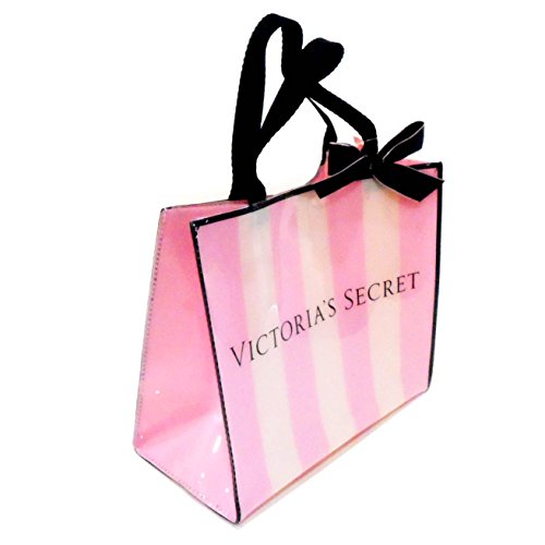 -. Feature : Victoria's Secret Pink Striped Beauty Makeup Plastic Bag with Bow / Dimensions: Length: 8", height: 7", depth: 4". / Bow on top