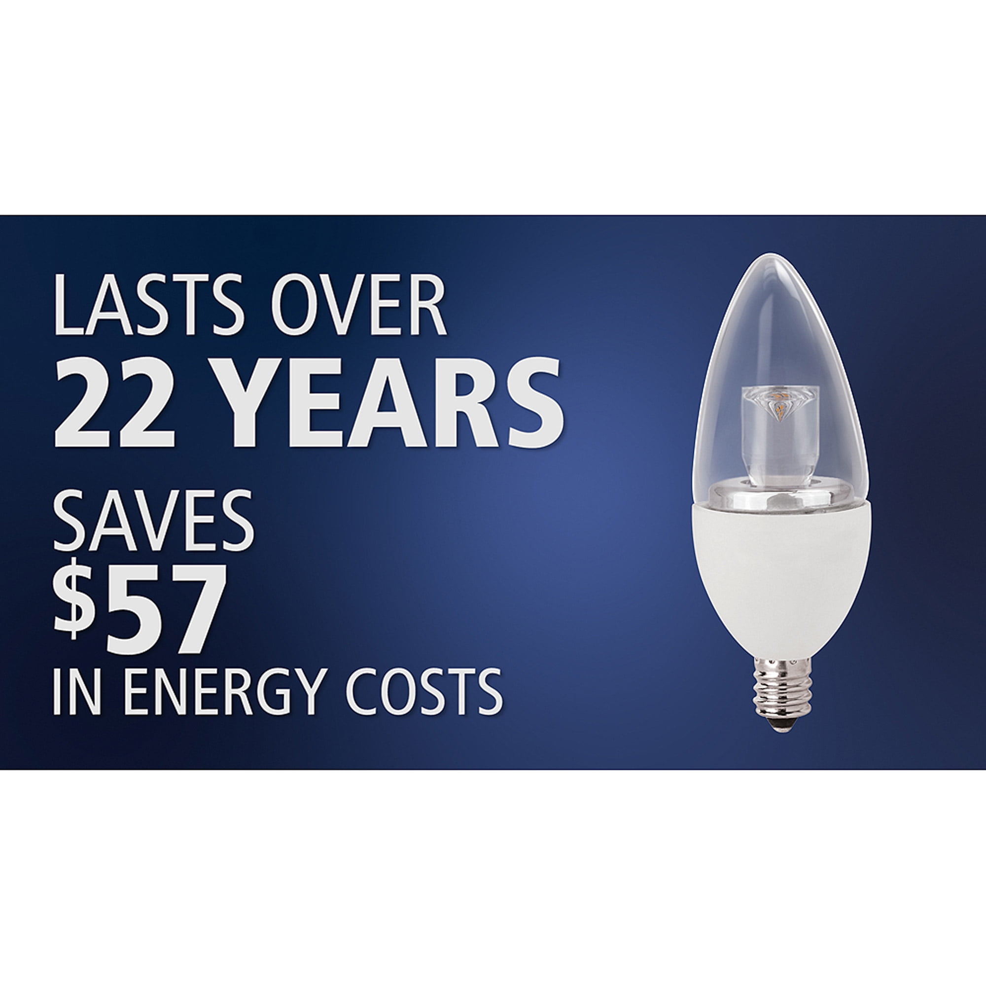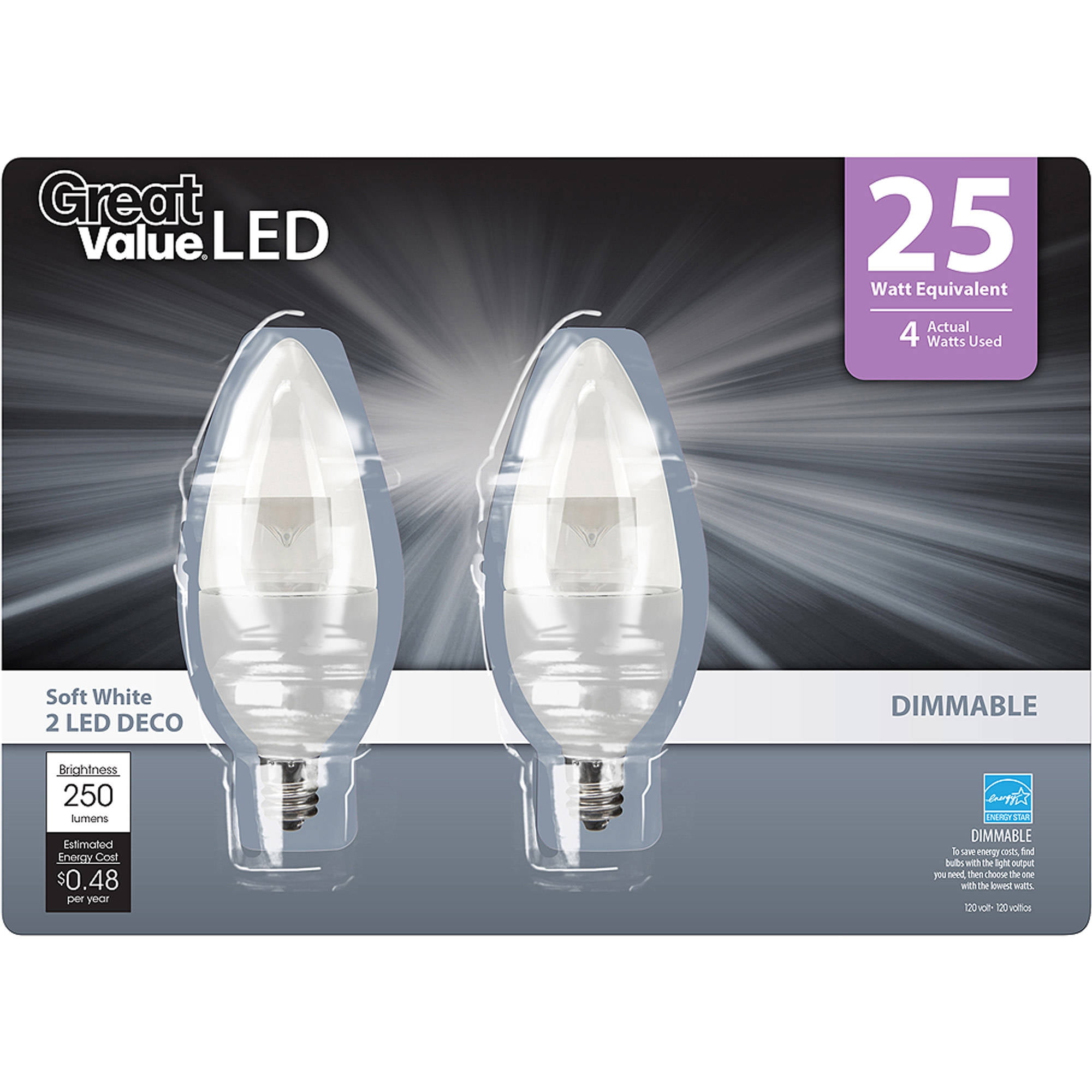 The Great Value LED Light Bulbs 4W (25W Equivalent) 4-Way Decorative, Dimmable, 2 Pack can keep any room illuminated. It is designed to save you up to 80 percent on energy costs. With just a flip of a switch, you can enjoy instant light output in your home or office. Its four-way style makes it ideal for reading and other indoor tasks. This Great Value LED bulb lasts for up to 25,000 hours and has a 25W equivalent using only 4W of energy.