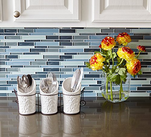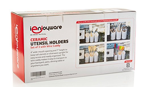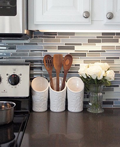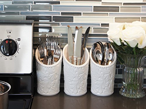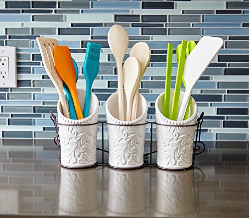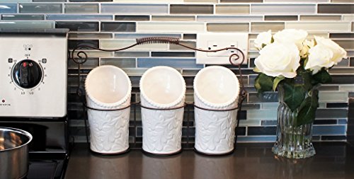 Kitchen Utensil Holders (4 Pieces) - 3 Ceramic Utensil Crocks (4" Dia x 7" H each) & 1 Metal Caddy - White & Embossed Design
